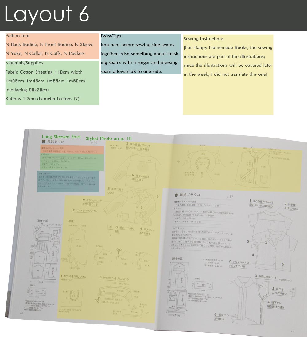 So I went through all 14 of my sewing books and identified six main instructions layouts, and you can see the first one above. I also included the books that have the same layout; click on the numbers for details on the books. The other 5 layout images are below. I quickly translated these six, and chances are good that you have one of the fourteen books that I own. Or, if you don’t own any yet, these are the ones that are typically available, so this should give you a pretty good sense of how to find information on the instruction pages. They’re even color-coded!