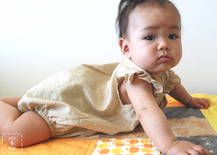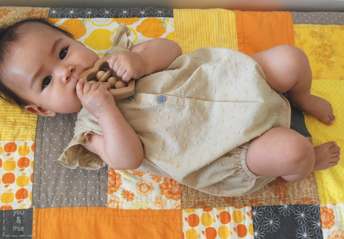 The only thing I would do differently next time is add a little length to the elastic for the leg openings. It’s hugging Kaya’s chubby thigh already and otherwise she’d be able to fit into this for awhile. And she’s not even a particularly chubby baby! Oh, I made the 3-6 mo. size again and it’s perfect.