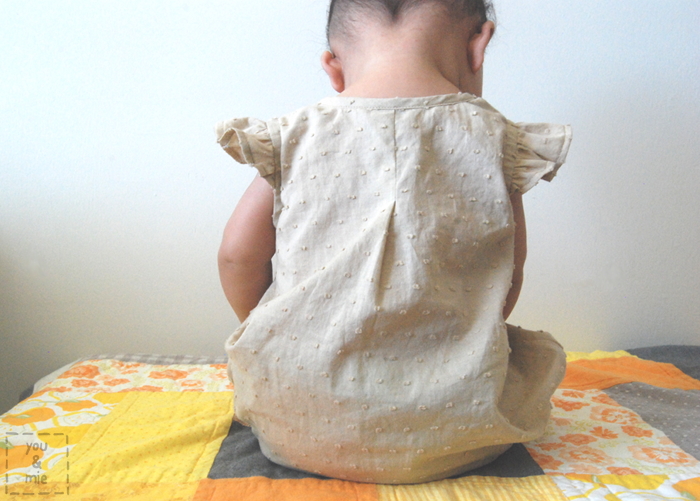 But back to this sweet number . . . the bodysuit features a snap placket at the neckline and also at the bottom for easy diaper changes. It has a cute pleat in the front and back and elasticized leg openings.