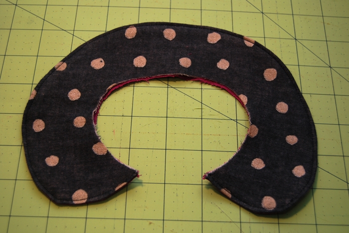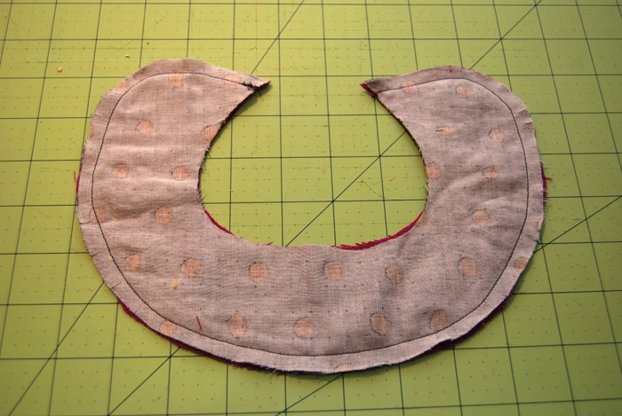 Place your collar pieces down (1 from Fabric A and 1 from Fabric B) with right sides together. Pin and sew the outer edge. Clip rounded edges to reduce bulk when you flip the collar right side out.