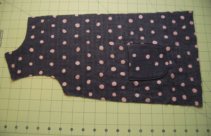 Flip the pocket right side out, press flat and sew onto one of the front coat pieces. Stitch close to the curved edge of the pocket, back stitching several times at the tops of the pocket to reinforce the corners (don’t sew the pocket closed!) Repeat with the other 2 pocket pieces for Fabric A.