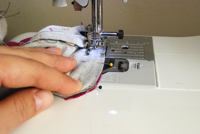 Place two pocket pieces together (right sides together) and pin. Sew around the edge, leaving a 1 inch opening. I like to sew along the opening as well because it helps flip the seam allowance in when you turn the pocket right side out.