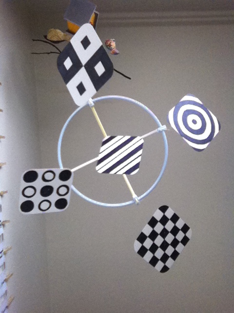 Out of aaaaall of the things that I made for my daughter when she was an infant, the one that was the most loved and the most used was a mobile similar to this. She. Loved. It. She was so mesmerized by the high contrast designs – we actually called it “the babysitter” for awhile because she could just lay there and stare at it forever!