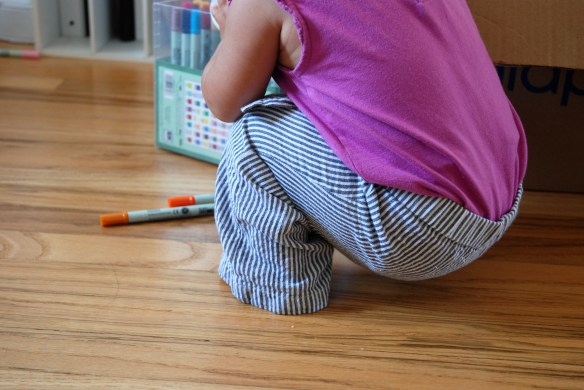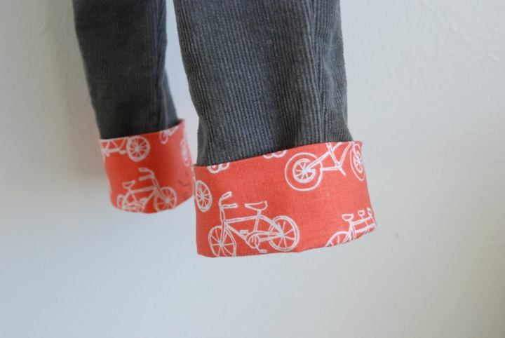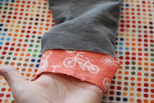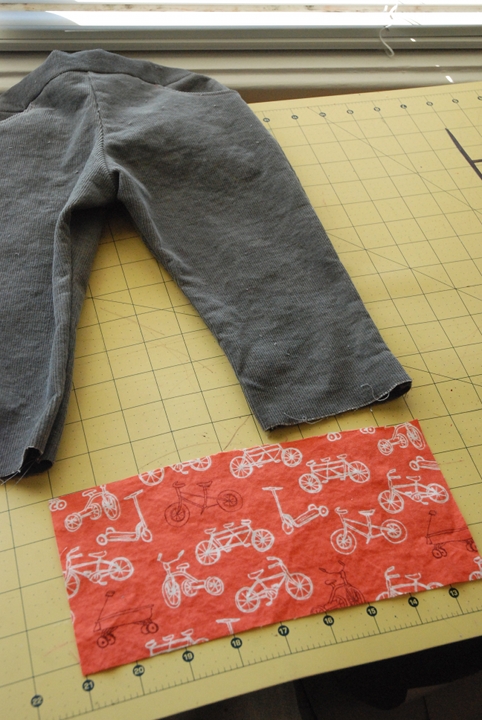 First, you want to hem up the bottom of your inset fabric. To figure out how much fabric you’ll need to hem, just decide how wide you want the bottom of your inset to be (my little toddler pants insets were about 4 inches wide) and then double that (because you’ll need two) and always add a couple inches for good measure. I skipped this step because I left the bottom of my pants unhemmed, but if I had, I would have hemmed about 10 inches of my inset fabric.