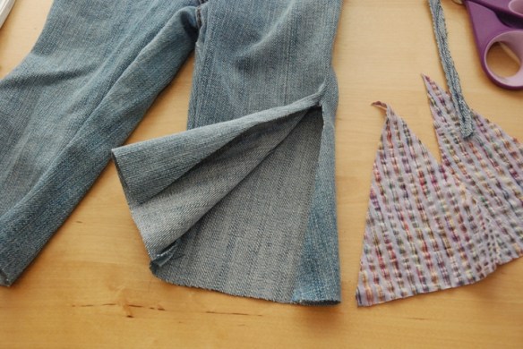 Now we’re going to cut 2 triangles from our inset fabric. The hemmed side will be the bottom of triangle (again, I didn’t hem, so just pretend :)). You want your triangle height to be about half an inch taller than the cut you made in your pants’ side seam. I cut about 8 inches up the pant leg, so the height of my triangles are 8.5 inches. As for the width of the bottom – that’s up to you. The wider the triangle base, the wider the flare. You decide!!