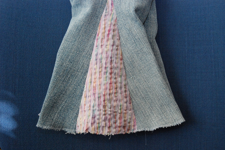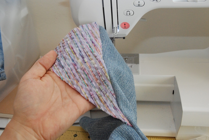 Now it’s time to sew! Line up one side of the triangle with one cut edge of the pants, right sides together. You want the bottom seams lined up. Pin and sew starting from the bottom with about a 1/4 inch seam allowance (my inset fabric looked the same on both sides, so there was no “wrong” side, but make sure your fabric is wrong side facing up).