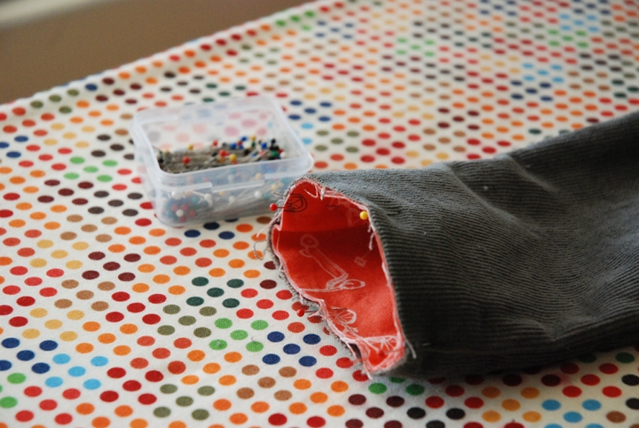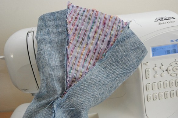 Now turn your pants inside out and line the other sides up, right sides together. Pin and sew. You want to try and get your seams to meet in the middle at the top of the triangle.