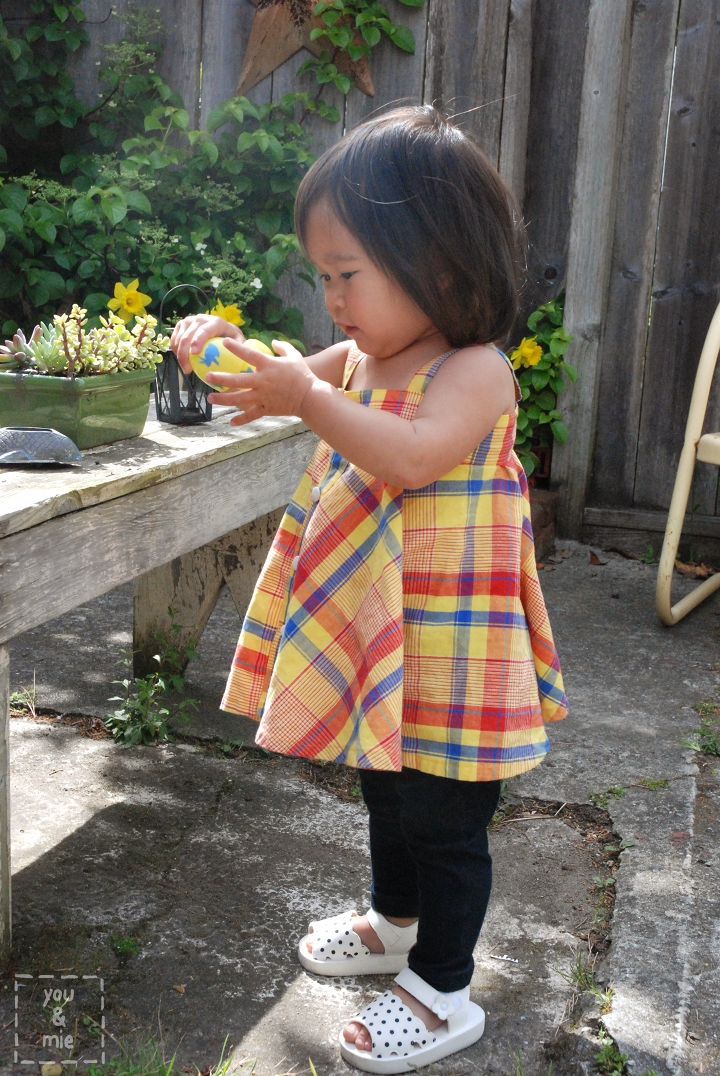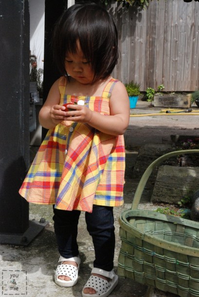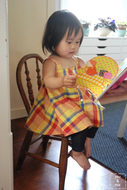 I also made a petticoat with tulle to give the dress more body, but I think I actually prefer the dress without. I guess it’s a good thing to keep around though. It can be paired with any skirt or dress and since it’s kinda huge, she can probably use it for a long time. This morning she just wore it around the house like a tutu and turned around in (very slow) circles. Where does she learn this from!?? 😛