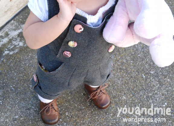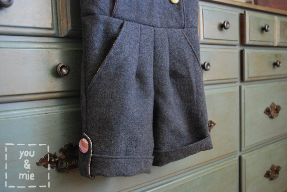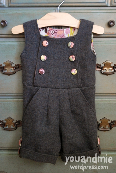 It took me a really long time to figure out how I wanted to remix the original pattern. I decided to go with shorts because I love this other denim romper that Yuki has. The gray wool was my sister’s idea, which I’m so glad I went with. It’s actually a wool gray and blue herringbone, though the blue is subtle. The wool makes it perfect for the winter in California! Warm and good for layering. I lined the romper bodice with some fabric I had left over from another project I’m working on. I didn’t really think it was going to be such a big part of the romper, but at the last minute I decided to use the same fabric to cover some buttons.