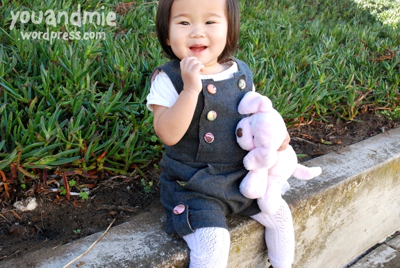 My poor daughter is really sick right now, so we didn’t get to take many photos. I’m just impressed she let me put her in the clothes (and she didn’t throw up on it!). Usually I can’t get her to stay still, but this time she would only stand there with her stuffed dog and hand up to her mouth. Poor baby 😦