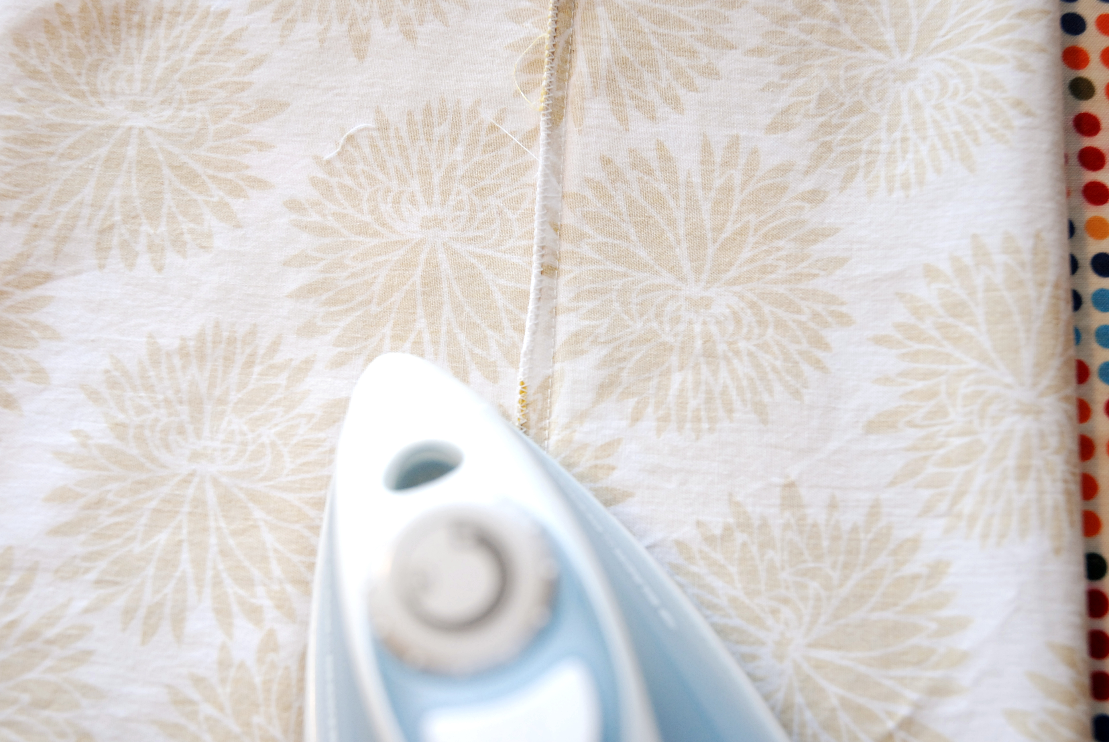 Flip the top layer down over the bottom layer. I did not want any of the white fabric to show at the top of the skirt, so instead of pressing it open right on the seam, I made the fold with about a 1/4 inch of the blue fabric on the inside of the skirt. This is why I didn’t add any seam allowance to the bottom layer fabric when cutting the length, but I added an extra 1/2 inch to the top layer – a 1/4 inch for seam allowance and another 1/4 inch to fold over to the inside of the skirt. Does this make sense??