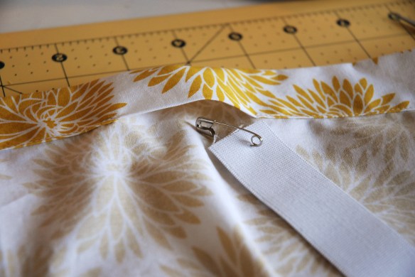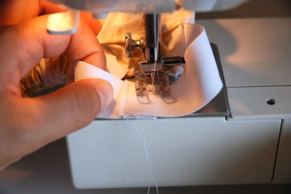 In the picture above, I was using the elastic to make sure I was sewing my casing wide enough. After you’re done, you should have a 2 inch gap that is open for you to slide the elastic through.