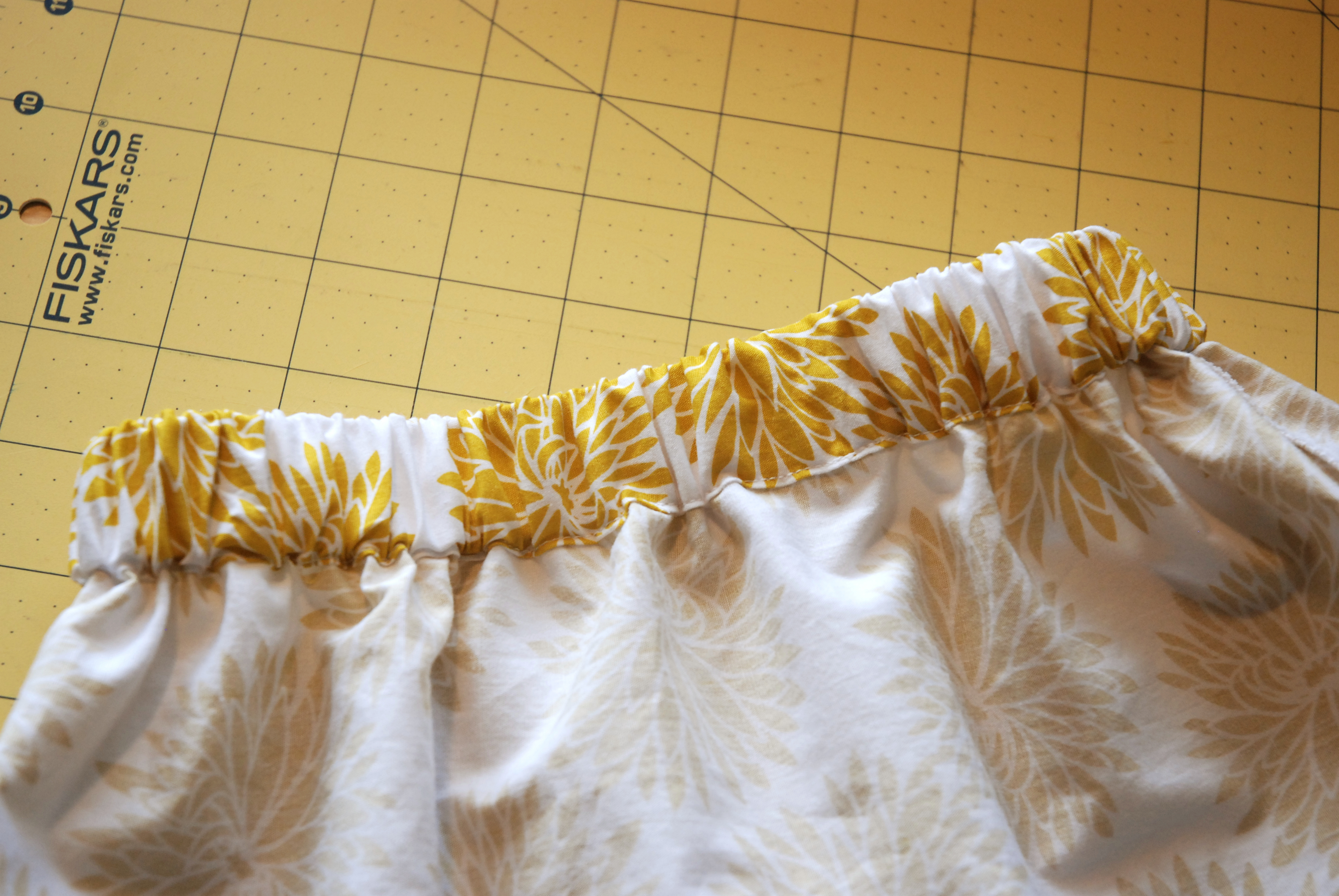 Sew along the top edge around the entire waist, using a 1/4 seam allowance, back stitching at the beginning and end.