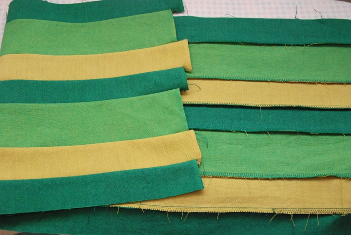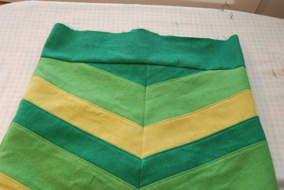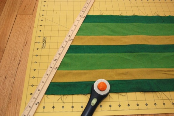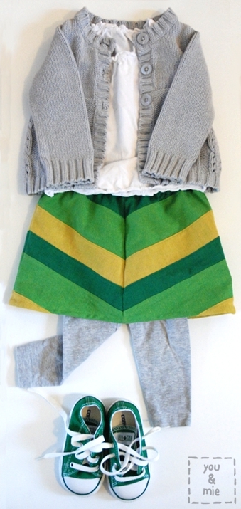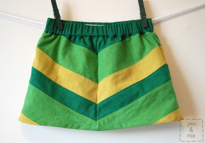 I made this skirt for St. Patrick’s Day and though I realize it’s a bit late for you to make one, it’s really a great skirt for any time of the year. This has been a pretty popular idea recently and my original inspiration was a skirt I saw a little girl wearing. Hers had bunch of different colors (maybe 10?) in skinny stripes, pieced together to make a chevron pattern. I wanted to recreate that skirt exactly (and maybe I still will), but for this holiday, I had these three lovely shades of green and greenish-yellow so I made some adjustments. I decided to make my stripes different widths to make it more interesting, but you can make yours as skinny or wide, and all the same or all different, as you want. And use as many colors as you want too!