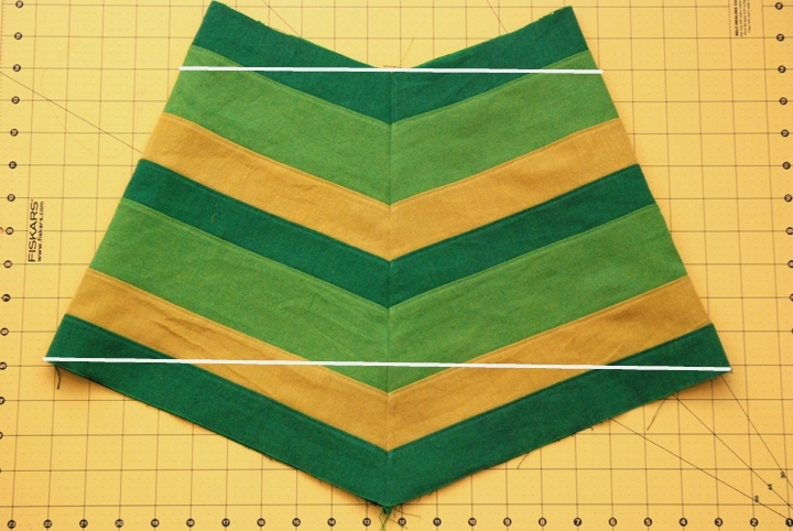 Next, you’d want to cut off the sides to make a rectangle. My skirt was getting tiny at this point and since I didn’t want it to be a mini skirt, I cut mine at a slight angle to leave more room at the bottom. Ideally though, if you have enough fabric, cutting it straight will give you a nice angle for your chevron pattern on the sides of the skirt.
