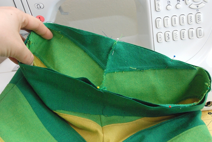 Now fold it down again to create a casing wide enough to fit your elastic. The folded edge should come down just past the bottom of the waistband, covering the seam ever so slightly.
