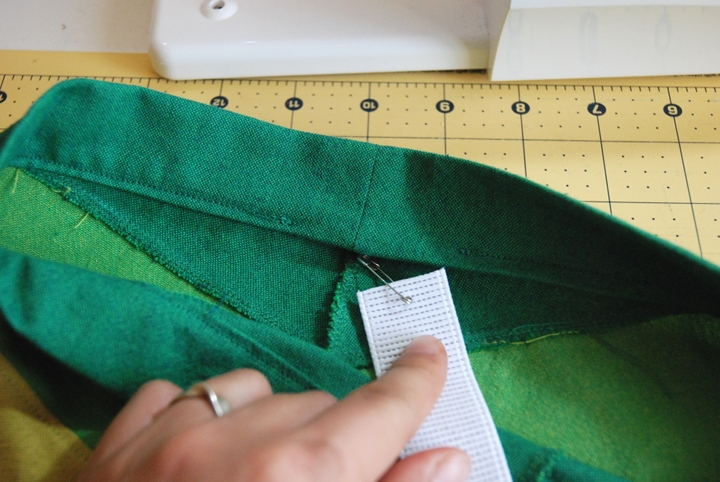 Sew the ends of the elastic together and finish top stitching the waistband to close the casing.