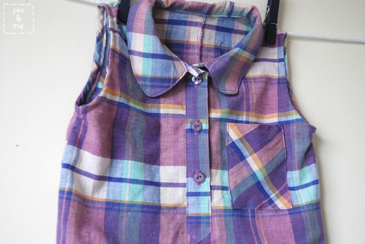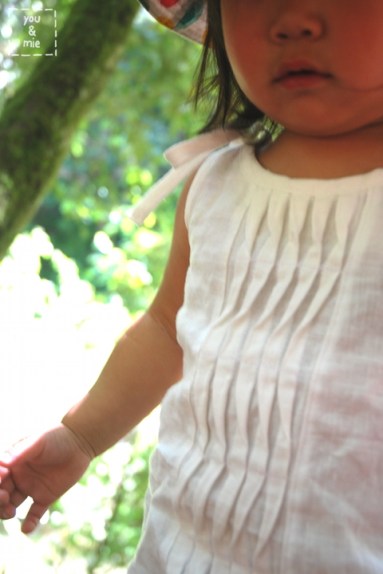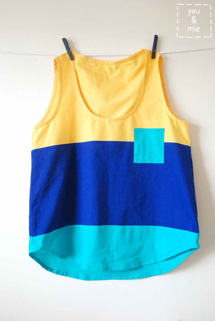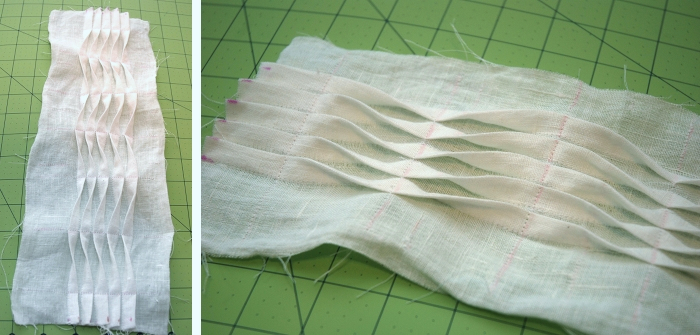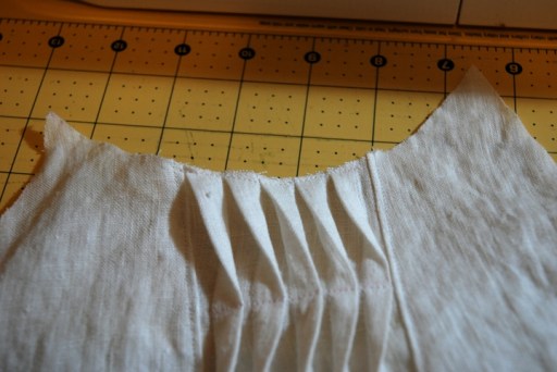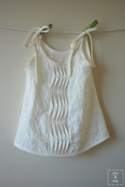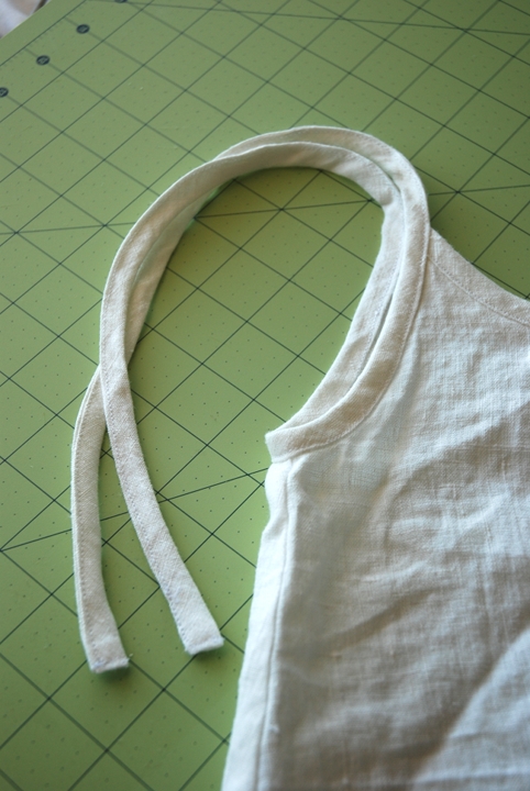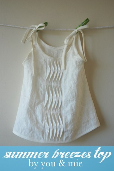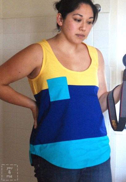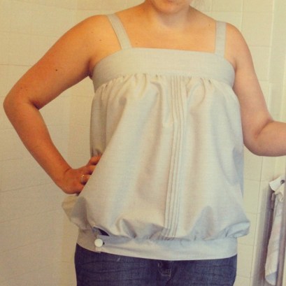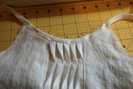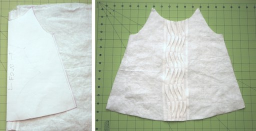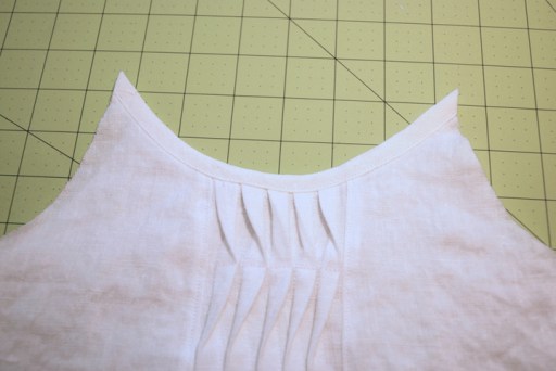 Once you’ve made your pleat, follow the pattern directions for constructing the tank. Sew the shoulder and side seams and finish the armholes and neckline with bias strips.