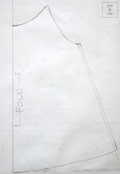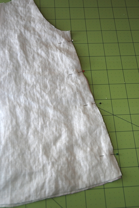 For the back piece, the only adjustment I made was lengthening it enough to match up with the side seam of the front piece (the 2 pink lines). Then I made an ever-so-slightly curved line for the bottom of the back piece.