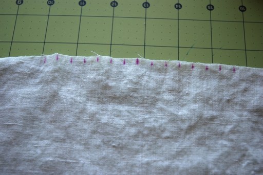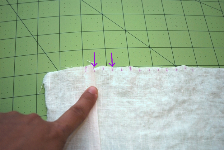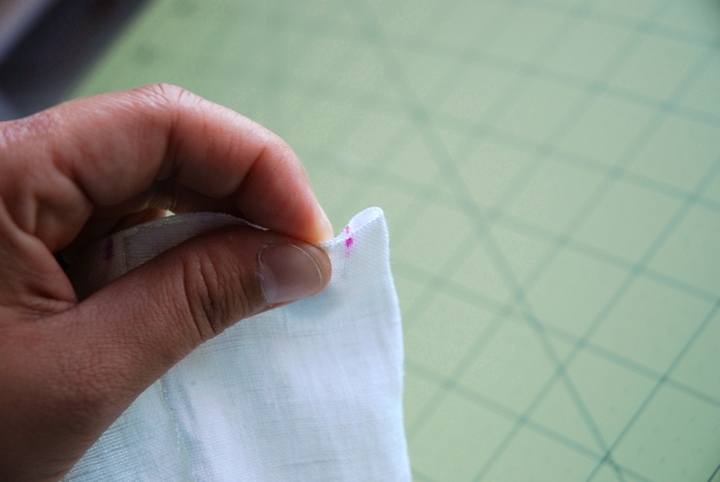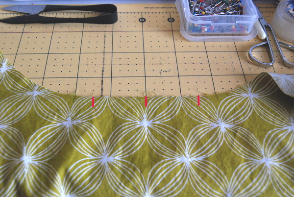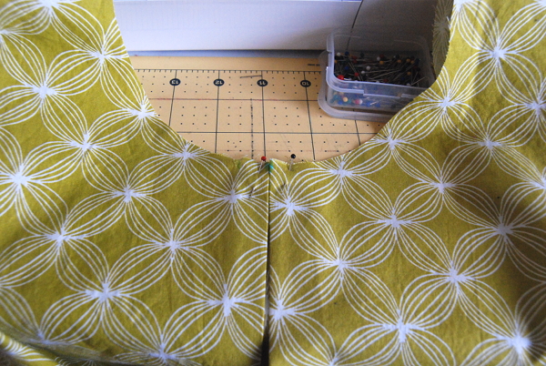 After you cut out your pieces, mark the center of the neckline on the front piece and then 1.5 inches on either side. These are your pleat markings.