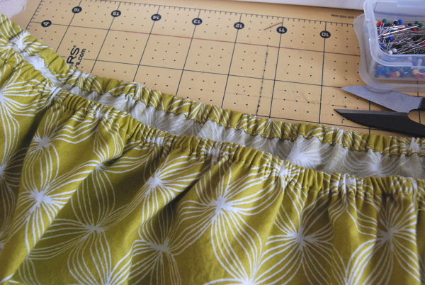 For the bottom, to make a casing, fold the hem up about a 1/4 inch, press and then fold again about 1/2 an inch. Sew along the folded edge all around the hem, but leave about an inch open to thread the elastic through. Measure your elastic and trim – it should fit comfortably but snuggly around your hips. Using a safety pin, guide the elastic through. Sew the ends of the elastic together and sew the rest of the casing closed.