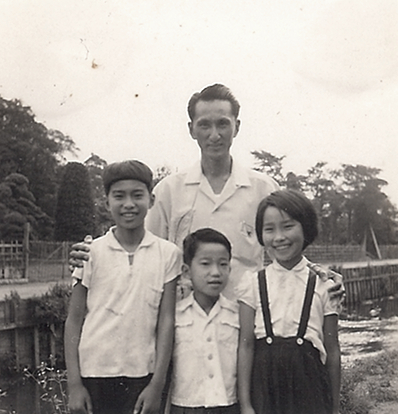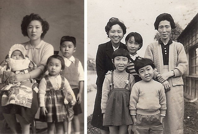(Left photo: My mom, standing in front, with her two brothers and mother