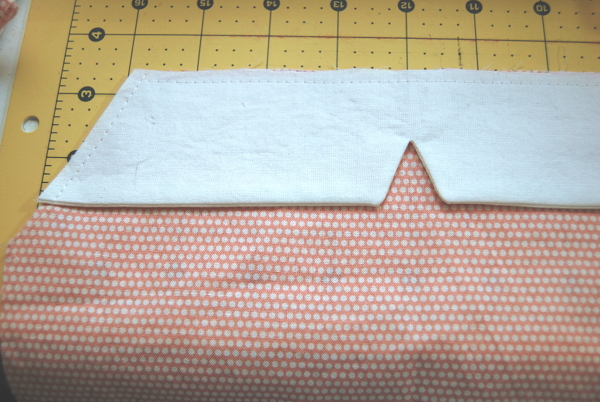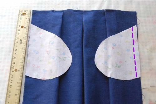 You’ll do the same for the back skirt piece except you’ll place your pocket pieces a 1/4 inch higher (or your seam allowance measurement) lower.  So while my front pocket pieces are placed 2 inches from the top, my back pocket pieces are 1 and 3/4 inch from the top.