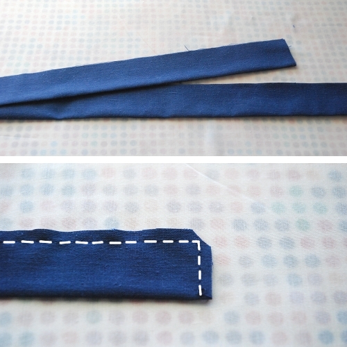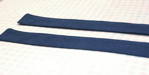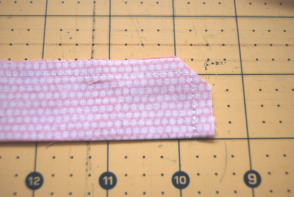 Put the skirt aside while we prepare the suspenders.  Fold the strips in half lengthwise with right sides together and press.  Sew down the length of the strip and down one end.  This will give you one closed end, but leave the other open.  Trim the corner.