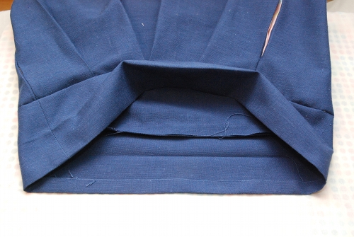 Flip the waistband up and press.  Fold the top of the waistband down towards the wrong side 1/2 inch.  When the waistband is folded down it should just barely cover the stitching at the bottom of the waistband.