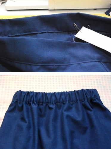 Using a safety pin, thread your elastic through the casing.  Before the end of the elastic is about to be pulled completely into the casing, sew up the waistband along the same line as the skirt’s side seam catching about a 1/2 inch of the elastic.  Continue pulling the elastic through until it’s about 1/2 an inch past the other side seam.  Top stitch the waist band vertically along the skirt side seam.