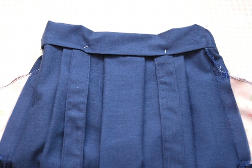 Open up the waistband and pin one raw edge to the top of the skirt, lining up the seam with the one of the side seams of the skirt.  Sew the skirt and waistband together all the way around with a 1/2 inch seam allowance.  Make sure the pleats are laying nice and flat.
