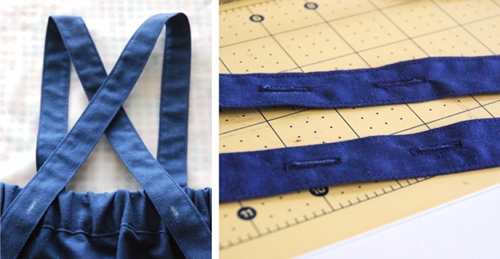 Carefully turn the skirt right-side out.  Top stitch just above the seam where the skirt meets the waistband.  Flip the suspenders up and top stitch along the front of the waistband just below the top.