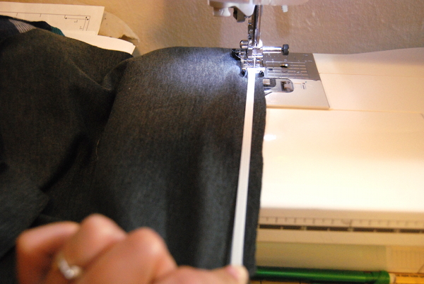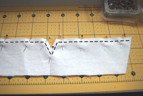 GeoDress9Remove the paper backing.  And here’s a trick I learned from sewing from Oliver + S patterns . . . Sew a basting stitch along the bottom 1/4 inch seam allowance.
