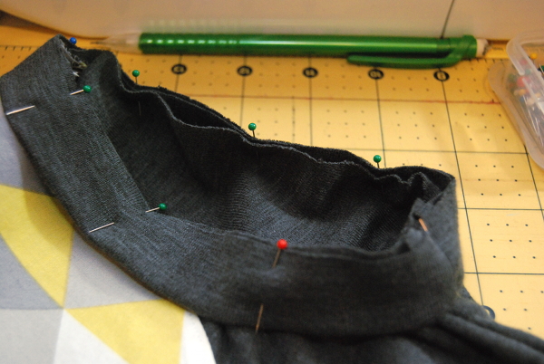 With the dress right side out, pin together the raw edges of the armhole finishing with the armhole.  Start by lining up the seams and pin all the way around stretching the band slightly and evenly as you pin.