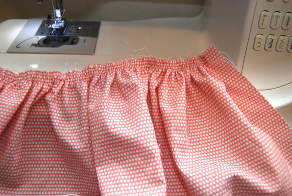 Pull one thread from each row to gather the skirt until it is the same width as the bodice.  Distribute the gathers evenly.