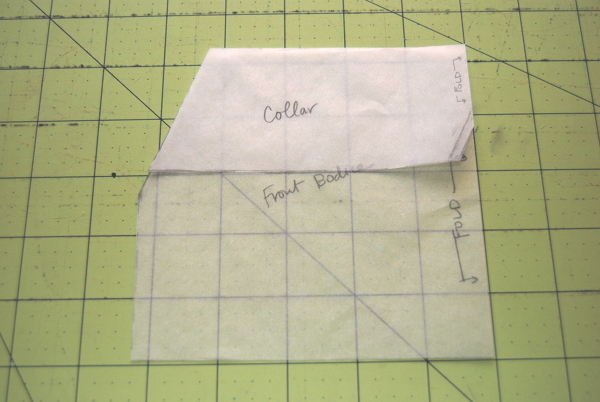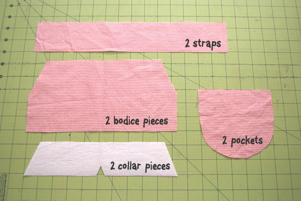 Cut out your dress pieces – one front bodice piece on the fold, one back bodice piece on the fold and the accent neckline on the fold.