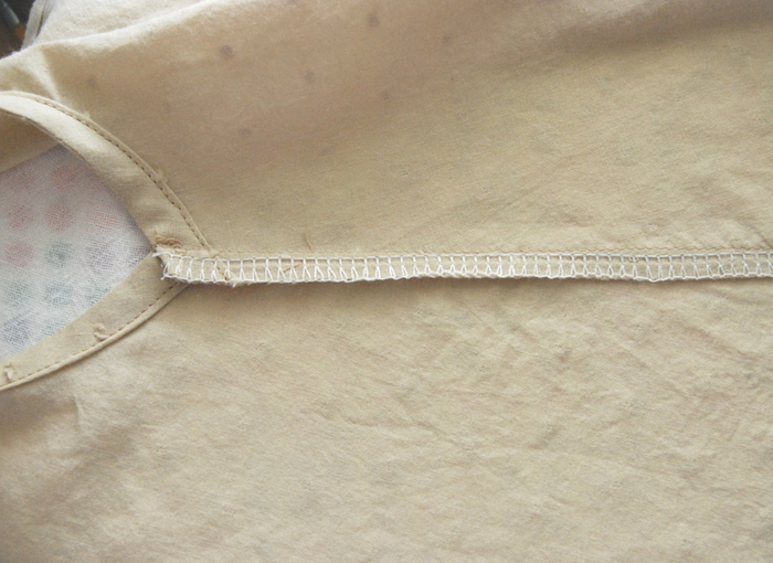 The second method is to pin the lining down so that it covers the previously stitched line and then, from the right side of the dress, top stitch along the bottom of the bodice.  While you’re at it, you can top stitch along the bottom and all the way around the ties and neckline, if you want to.  It’s purely up to your personal/aesthetic preference.  I opted for the hand sewing.
