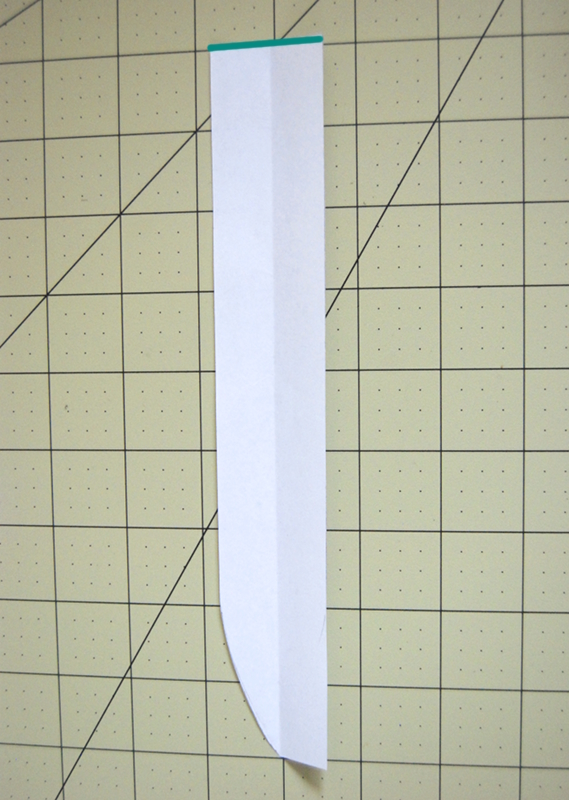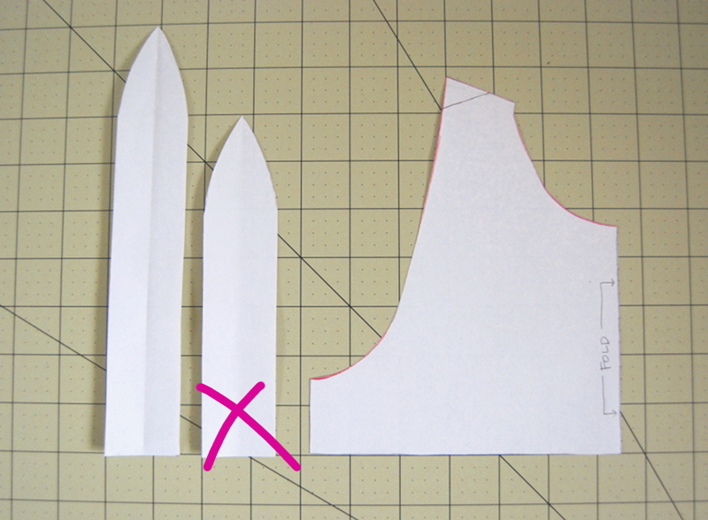 The width of your tie pattern will be the same measurement as that turquoise and magenta line up there, somewhere around 2 inches (mine is narrower because of the small SA).  Cut out a strip of paper with your measurements, fold it in half lengthwise and taper one end starting 2 inches from the tip.  I drew and cut one side, then folded it in half to trace the other side so that it is symmetrical.